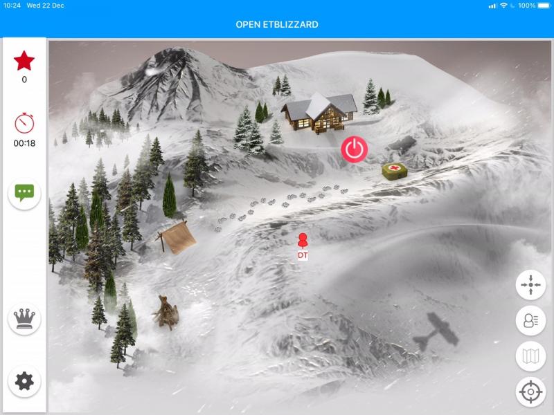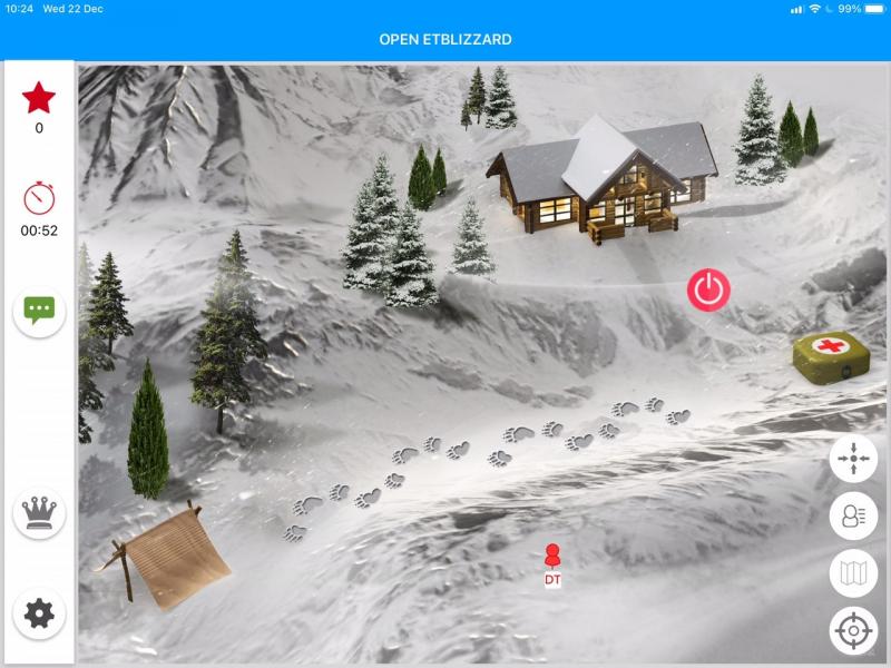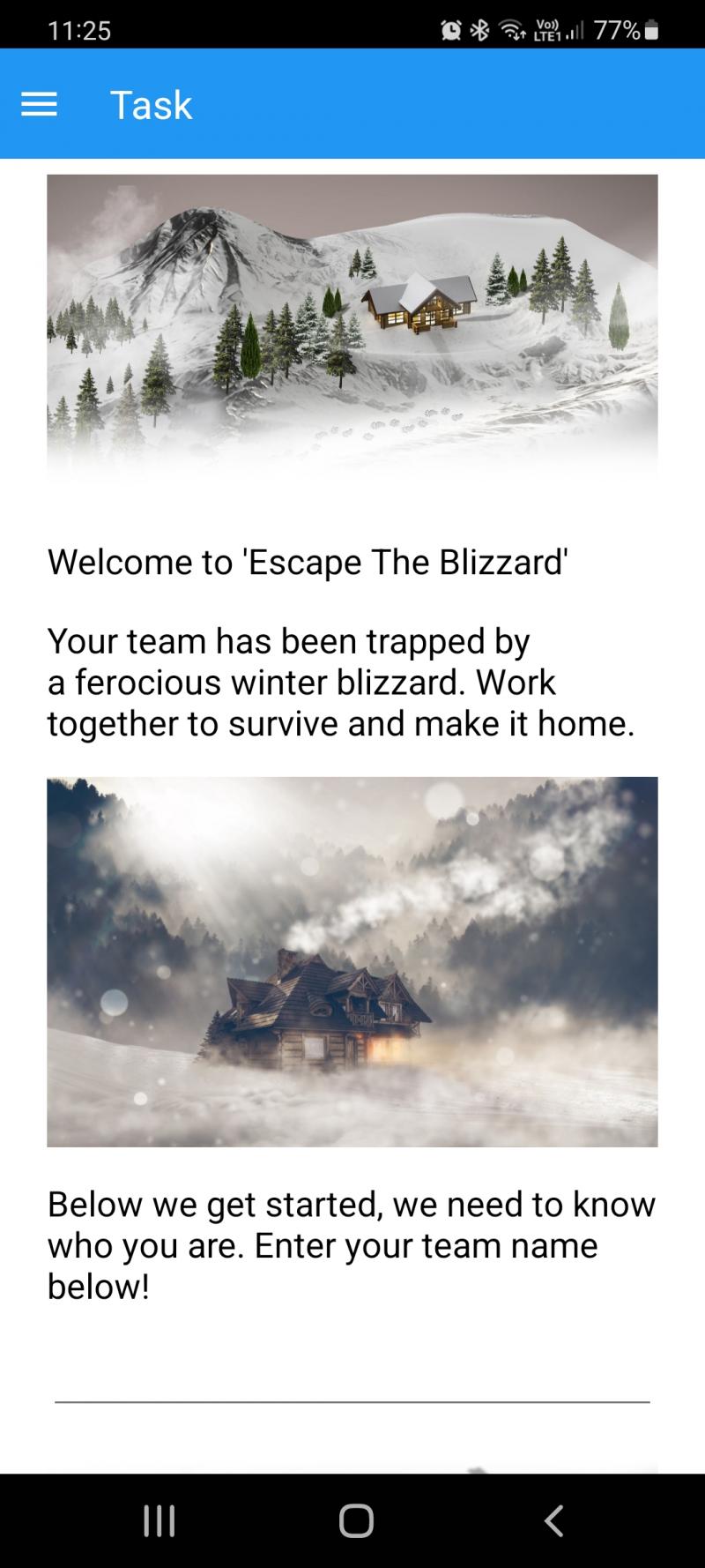 Escape the Blizzard commence dans un centre de formation où les équipes sont chargées d’apprendre des techniques de survie qui peuvent s’avérer utiles avec les conditions météorologiques dévastatrices d’aujourd’hui. À l’aide de notre technologie basée sur une application, les équipes apprennent, s’exercent et s’affrontent en face à face dans plusieurs défis sur le thème des compétences de survie par le biais de questions-réponses, de photos et de vidéos. Les thèmes abordés sont la navigation, les abris, les nœuds, le feu, la connaissance des animaux, la filtration de l’eau, la signalisation, les premiers secours et la nourriture. Il y a trop de catégories pour qu’une équipe puisse en venir à bout.
