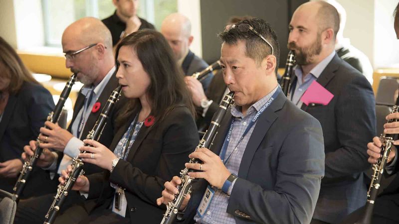 Les participants choisissent parmi les instruments mis à leur disposition : instruments à cordes, à vent, cuivres et percussions. Sous la direction de professionnels, ils apprennent à jouer, par sections, comme dans un vrai orchestre symphonique. Par la suite, la répétition générale se fait sous la direction du chef d’orchestre. L’interprétation finale est une pièce écrite spécialement pour votre équipe et sera d’une durée de 5 minutes. .